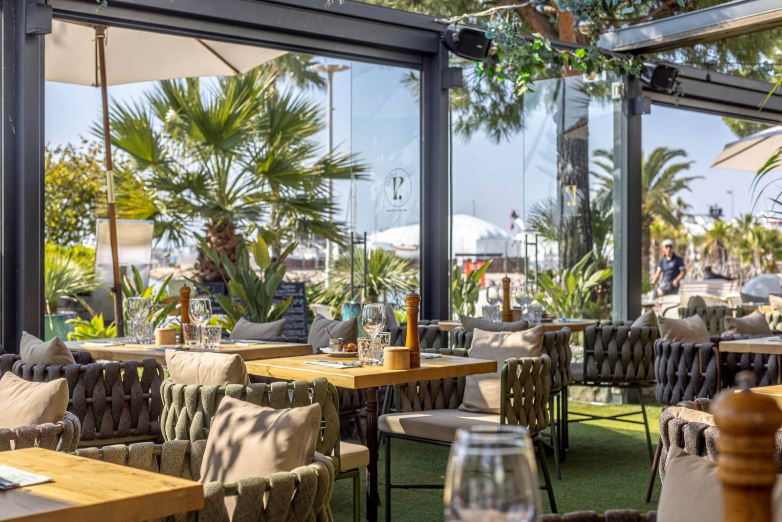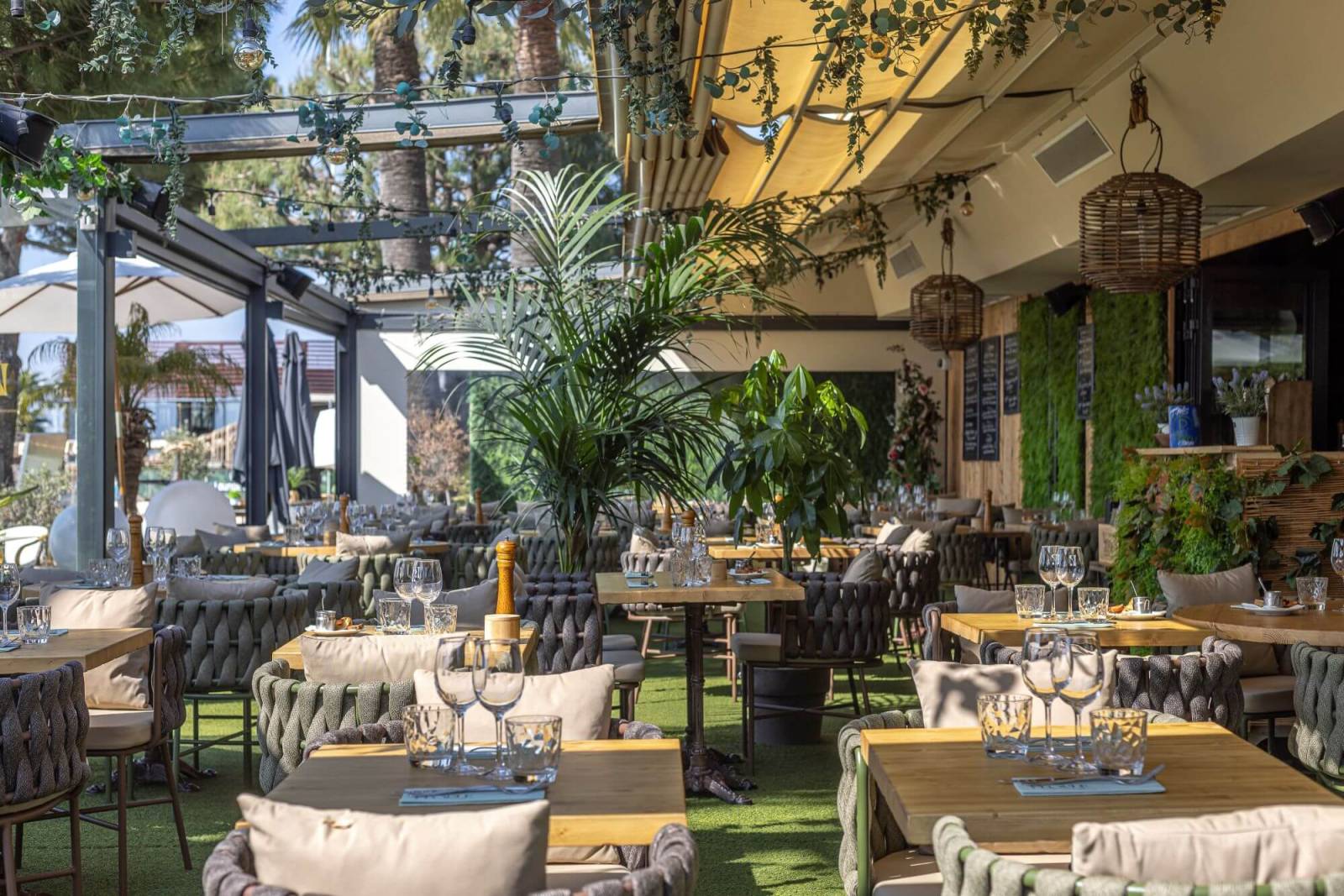 Côté extérieur, la terrasse prolonge cette ambiance à ciel ouvert. Entourée de palmiers et de feuillages exotiques, elle invite à la détente dans un décor balnéaire assumé. Le mobilier en corde tressée, les tables en bois et le gazon synthétique au sol participent à une atmosphère de jardin lounge en bord de mer. Que ce soit pour un déjeuner ensoleillé, un apéritif entre amis ou une soirée animée au rythme de la musique, chaque détail a été pensé pour sublimer l’instant.