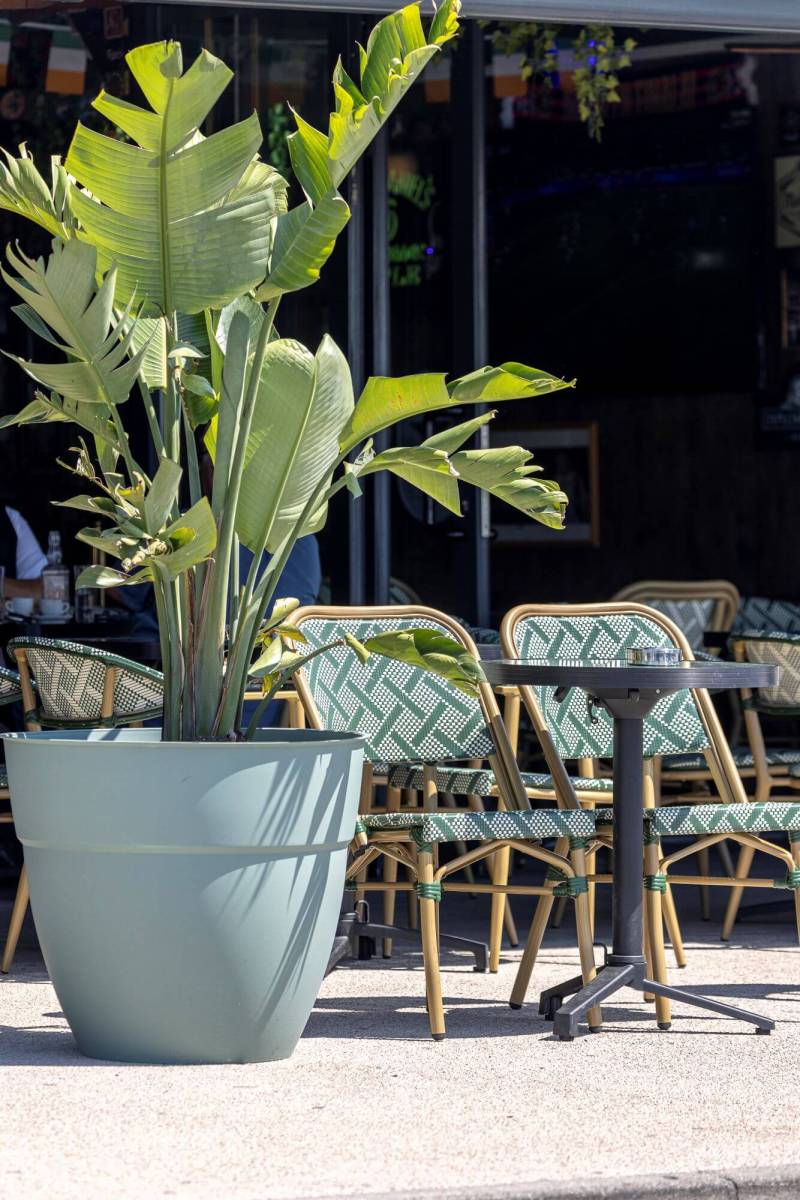 Les chaises extérieures en aluminium, tressées en fibre synthétique vert anglais et ivoire, évoquent les classiques bistrots parisiens tout en s'intégrant harmonieusement à l’esprit irlandais du lieu.