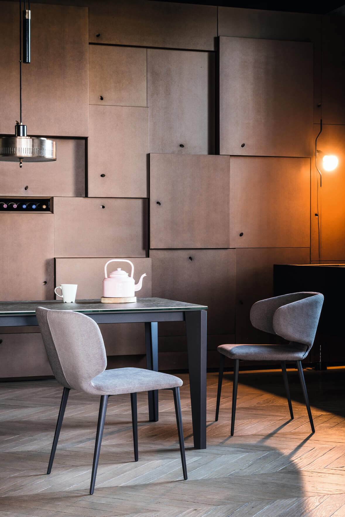 Cette chaise de repas de la collection Wrap vous garantit un grand confort avec son dossier en peau, similicuir ou en tissu. Cette collection est composée de chaises avec accoudoirs ainsi que des tabourets avec une structure en acier laqué.