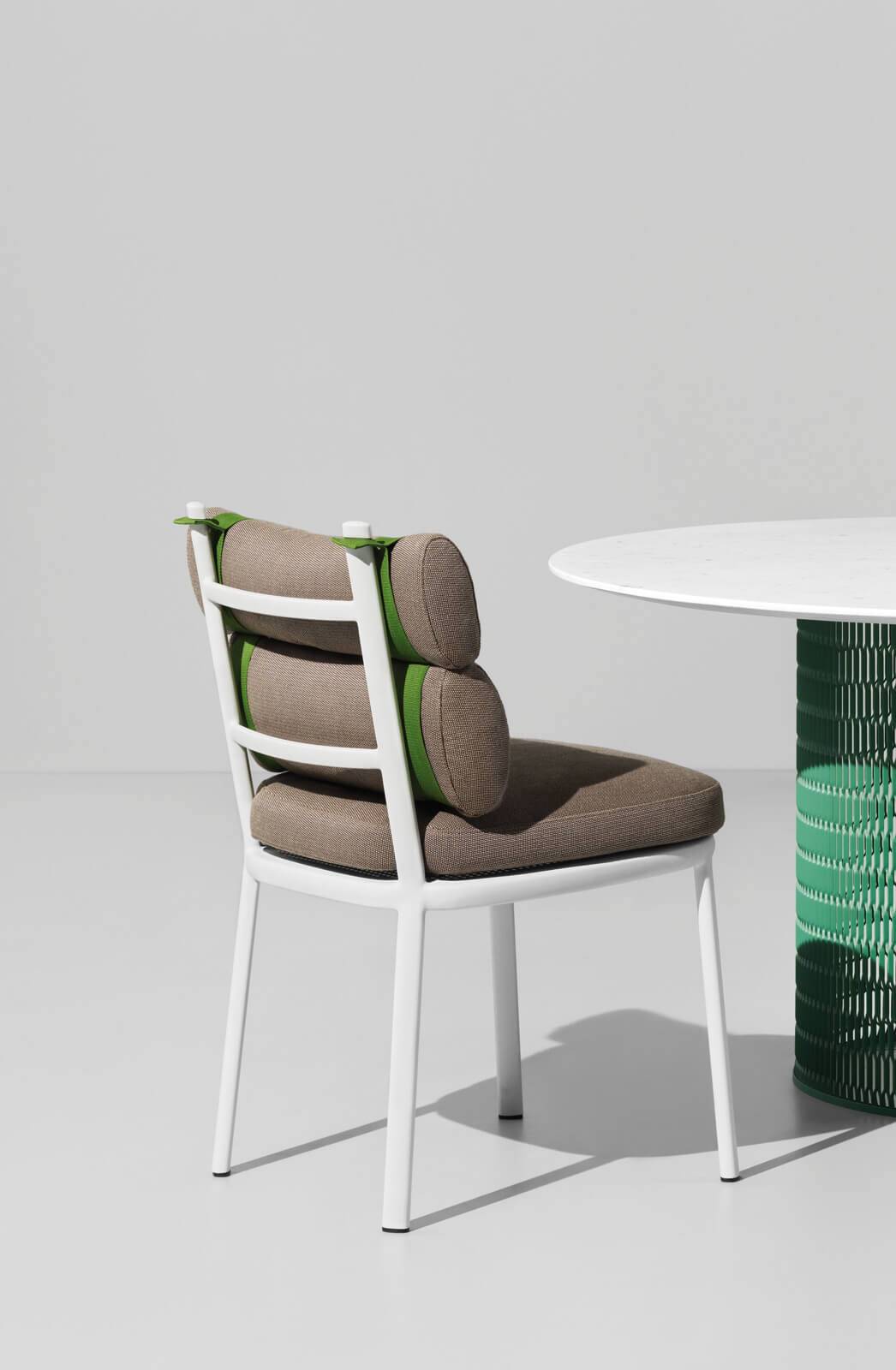 Cette chaise de repas de la collection ROLL, au dossier composé de deux coussins façonnés en rouleaux, reliés par des sangles de couleur, vous apportera un confort sans faille.